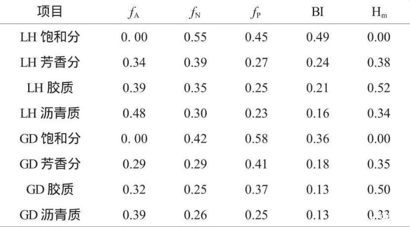 可以看出,隨著組分的增重,兩種稠油組分系類列的fA逐漸變大,fN、fP、BI逐漸變小。兩個系列的不同在于,遼河稠油組分的fA、fN和BI均大于孤島稠油組分,即芳香碳率、環(huán)烷碳率、烷鏈支化度較高。因此,遼河稠油組分中共軛成分含量大于孤島稠油組分。