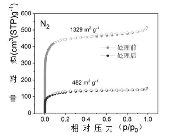 步驟1所用活性碳纖維以及本實(shí)施例制備得到的高能量轉(zhuǎn)化效率的碳材料的氮?dú)馕摳綔y(cè)試可以看出:制備前活性碳纖維的氮?dú)馕摳綔y(cè)出比表面積為1329m2/g,經(jīng)過(guò)處理,比表面積降至482m2/g,說(shuō)明蒽在孔內(nèi)的沉積改變了孔的結(jié)構(gòu),減小了孔容,孔腹尺寸被收縮;