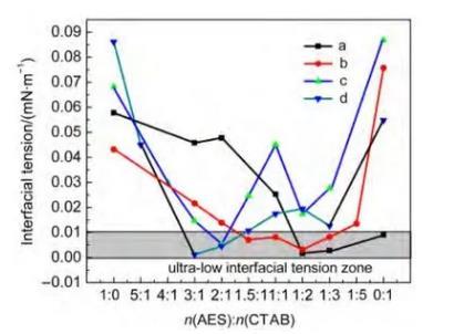 然而,在所涉及的克拉瑪依油田的五個(gè)實(shí)際油水體系(七中、陸九、石西、莫北、石南)中,烷基季銨鹽CTAB與AES復(fù)配體系均觀測(cè)到了沉淀,沉淀導(dǎo)致體系中有效的表面活性劑濃度下降,造成油水界面上的表面活性劑的濃度隨之下降,使得在這五個(gè)實(shí)際油水體系中均未獲得超低界面張力。因此,必須對(duì)表面活性劑親水基間的相互作用進(jìn)行調(diào)整,以保證陰陽(yáng)離子表面活性劑在復(fù)配體系中的有效濃度。