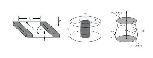 液層模型是源自于空間晶體生長實驗探索的簡化模型,是研究微重力條件下界面張力梯度驅動對流基本流動規律的經典模型。液層模型主要包括矩形液層(rectangular pool)、環形液層(annular pool)和液橋(liquid bridge)(圖1)等。相對而言,液橋是一類特殊的液層模型。液橋中界面張力梯度驅動對流的流動穩定性研究成果極為豐富,相關系統的完整臨界轉捩描述詳見綜述(Hu et al.2008)。除了極薄液層的情況,在絕大多數界面張力梯度驅動對流的地面實驗研究中,界面張力效應和重力效應間存在較強的耦合作用。