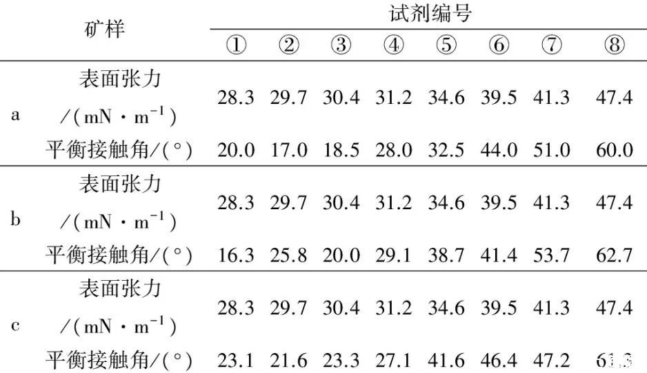 其中3種礦樣的表面張力和接觸角對應值如表1所示。
