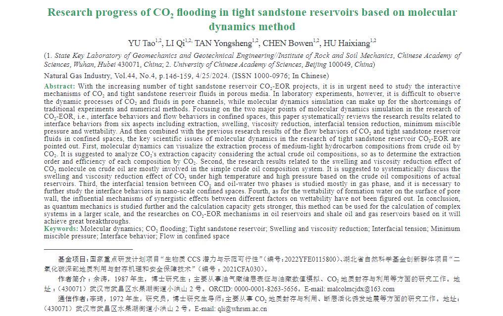 隨著致密砂巖儲層CO2-EOR項目的不斷增加,亟需對CO2與致密砂巖儲層流體在孔隙介質中的相互作用機理進行研究,但室內實驗難以觀察到CO2與流體在孔隙通道中的動態過程,而分子動力學模擬則可以彌補傳統實驗和數值方法的不足。為此,圍繞該方法在CO2-EOR研究中的2大重點——界面行為與受限空間運移行為,對包括萃取、溶脹、降黏、降低界面張力、最小混相壓力、潤濕性等6個方面界面行為的相關研究成果進行了系統梳理,結合前人對CO2與致密砂巖儲層流體在受限空間中運移行為的研究成果,提出了分子動力學在致密砂巖儲層CO2-EOR研究中的關鍵科學問題。