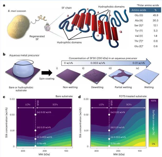 圖1作為天然表面活性劑的SF。b,旋轉(zhuǎn)涂層金屬水合物提高表面覆蓋率的示意圖。金屬水合物溶液的表面覆蓋率的示意圖。c,d,添加了SF的金屬水溶液的表面覆蓋率(%)。的表面覆蓋率(%)。基底(c)和基底上的表面覆蓋率(%)?;祝╠)上SF添加的金屬水溶液的表面覆蓋率(%)與濃度和分子量的函數(shù)關(guān)系。