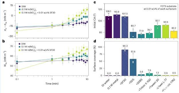 從熱力學(xué)角度來看,潤濕是液體在固體表面擴展以最小化自由能的現(xiàn)象。液體在固體上的潤濕性可通過界面能和粘附功來評估,分別由楊氏方程和粘附功方程表示。本文評估了含絲素蛋白(SF)溶液在疏水性基底上的表面張力和接觸角(CA)變化,使用煮沸30分鐘的SF(SF30)。結(jié)果顯示,盡管SF30溶液的表面張力變化與對照組相似,但其接觸角顯著降低(補充圖2),表明潤濕增強主要通過改變液-固界面能實現(xiàn),而非降低溶液表面張力。圖2a顯示,SF摻雜溶液與固體表面之間的界面能顯著降低,圖2b顯示界面粘附力增加。與六種商用表面活性劑相比,盡管它們有效降低了溶液表面張力,但對界面能的控制不及SF(圖2c,d)。SF30在疏水性基底上的表面覆蓋率超過90%,且優(yōu)于分子量相近的合成表面活性劑(延伸數(shù)據(jù)圖1)。