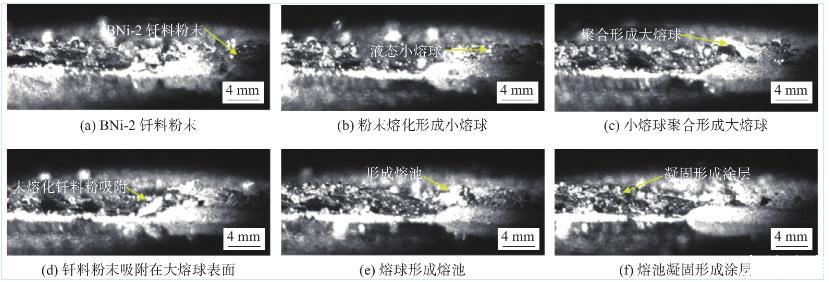 圖3是激光釬涂過程中的超高速攝影照片(4000幅/s),直觀地表征了激光釬涂過程中釬料粉末在激光作用下熔化、鋪展、凝固的過程。從圖3中可看出,在激光釬涂過程中,釬料呈現(xiàn)4種狀態(tài),分別為粉末態(tài)、熔球態(tài)、熔池態(tài)、凝固態(tài)。在激光未掃描的位置,釬料保持原始的粉末狀態(tài),如圖3a所示。被激光束掃到的位置,粉末態(tài)的釬料吸收能量,升溫熔化,形成尺寸較小的液態(tài)熔球,如圖3b所示。隨后,粉末釬料的不斷熔化形成更多液態(tài)小熔球,尺寸較小的熔球互相結(jié)合匯聚成尺寸較大的液態(tài)熔球,如圖3c所示。同時可觀察到未熔化的釬料粉末在液/固界面張力作用下,逐漸被吸附到尺寸較大的熔球表面,如圖3d所示。隨著激光逐漸向前掃描,熔球不斷長大,當(dāng)熔球固相表面張力與重力的合力作用大于液/固界面張力后,大尺寸熔球在基體鋪展?jié)櫇瘢纬扇鄢兀鐖D3e所示。最后,隨著激光熱源的移動,激光后端的熔池溫度逐漸降低,液態(tài)釬料逐漸凝固,在基體表面形成涂層,如圖3f所示。