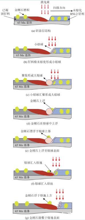 (2)金剛石釬涂層的成形歷經(jīng)粉末釬料熔化、液態(tài)釬料聚合、釬料微粉吸附熔合、釬料潤濕鋪展、金剛石遷移至涂層表層、涂層凝固成形6個階段,金剛石釬涂過程中,金剛石趨向于沿著熔體表面邊緣上浮,這主要是由于金剛石與液態(tài)釬料之間的界面張力遠(yuǎn)大于與固態(tài)基體界面張力所致。