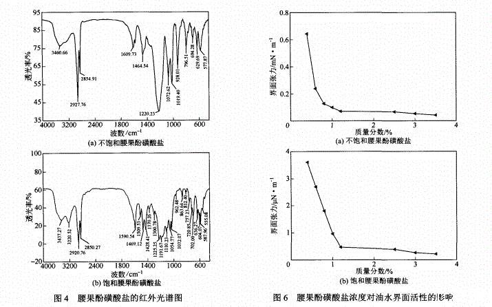 (1)采用生物質腰果酚和飽和腰果酚為原料,通過磺化和中和兩步反應合成了兩種具有兩親性質的腰果酚磺酸鹽。紅外光譜表征結果表明,所合成的化合物與理論結構基本相符。