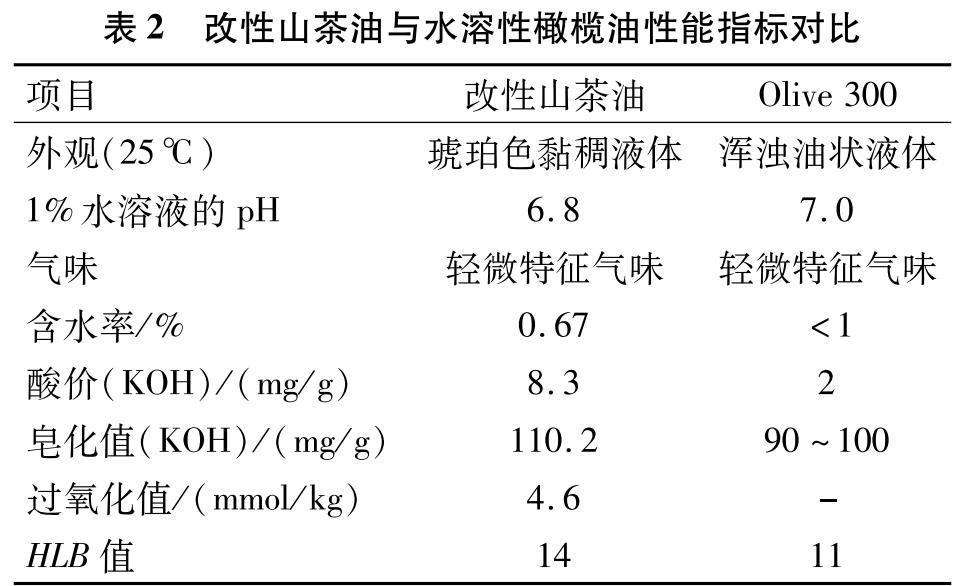 改性山茶油與水溶性橄欖油(Olive 300)的各項(xiàng)性能指標(biāo)如表2所示。