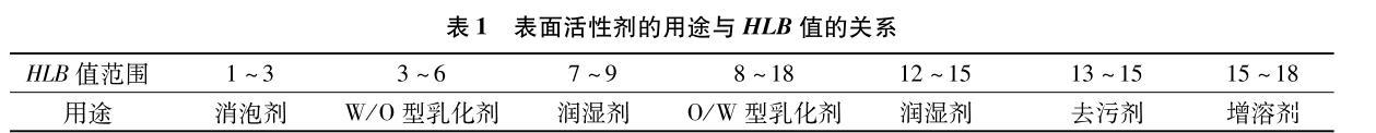 HLB值可用來(lái)衡量表面活性劑的親水親油性的大小,HLB值越大代表親水性越強(qiáng),HLB值越小代表親油性越強(qiáng),HLB值的轉(zhuǎn)折點(diǎn)為10,HLB值大于10一般為親水性,HLB值小于10為親油性,人們一般以HLB值為標(biāo)準(zhǔn)指導(dǎo)表面活性劑的實(shí)際應(yīng)用(見表1)。