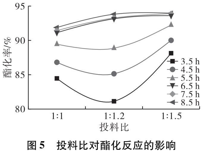 在投料比分別取1∶1、1∶1.2、1∶1.5,預(yù)熱溫度80℃,預(yù)熱時(shí)間5 min,0.4%的4?型分子篩催化劑,反應(yīng)溫度180℃,反應(yīng)時(shí)間8.5 h條件下進(jìn)行酯化反應(yīng)。反應(yīng)3.5 h后每隔1 h取樣測(cè)試產(chǎn)物酸價(jià),計(jì)算酯化率隨時(shí)間的變化,結(jié)果如圖5所示。
