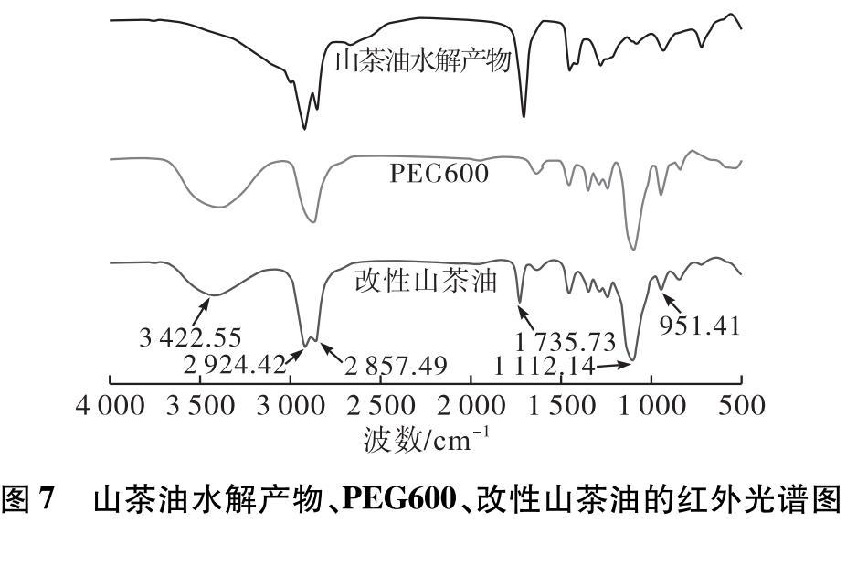 由圖7可知,改性山茶油紅外光譜圖在3 422.55 cm-1處的峰為—OH的伸縮振動(dòng)吸收峰,2 924.42 cm-1處的峰為—CH2—的不對(duì)稱伸縮振動(dòng)峰,2 857.49 cm-1處的峰對(duì)應(yīng)的是—CH2—對(duì)稱伸縮振動(dòng)峰,1 735.73 cm-1處的峰對(duì)應(yīng)的是酯化反應(yīng)中羰基的特征吸收峰,1 112.14 cm-1處對(duì)應(yīng)的峰是C—O—C的不對(duì)稱伸縮振動(dòng)吸收峰,951.41 cm-1處所對(duì)應(yīng)的峰是C—O—C的伸縮振動(dòng)吸收峰。通過(guò)對(duì)譜圖的解析,從改性山茶油的紅外譜圖中找到了羰基的特征吸收峰,因此可以推斷PEG600和山茶油水解產(chǎn)物發(fā)生了酯化反應(yīng)。