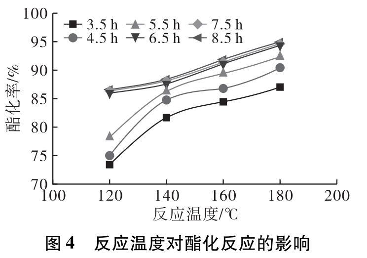 在投料比1∶1,預(yù)熱溫度80℃,預(yù)熱時(shí)間5 min,0.4%的4?型分子篩催化劑,分別設(shè)定反應(yīng)溫度為120、140、160、180℃,反應(yīng)時(shí)間8.5 h條件下進(jìn)行酯化反應(yīng)。反應(yīng)3.5 h后每隔1 h取樣測(cè)試產(chǎn)物酸價(jià),計(jì)算酯化率隨時(shí)間的變化,結(jié)果如圖4所示。