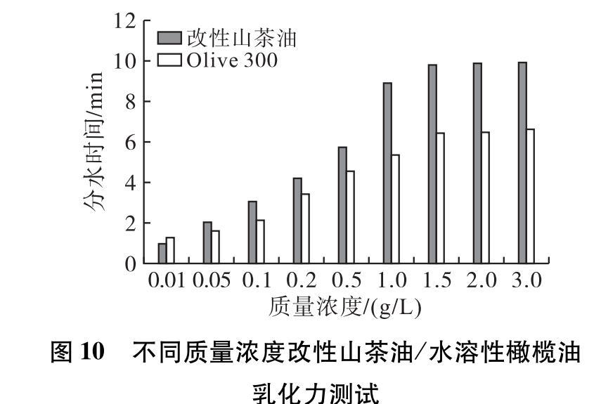 采用分水法對(duì)不同質(zhì)量濃度的改性山茶油和水溶性橄欖油(Olive 300)進(jìn)行乳化力測(cè)試,分水時(shí)間越長(zhǎng)表明乳化性能越好,其結(jié)果如圖10所示。
