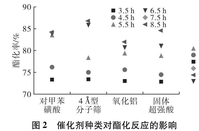 由圖2可知,在相同的工藝條件下4?型分子篩的催化效率高于其他催化劑。原因主要有兩點(diǎn):首先,4?型分子篩復(fù)雜的孔道結(jié)構(gòu)性相比其他催化劑增加了催化反應(yīng)面積,并且具有較高的活性和穩(wěn)定性;其次,由于試驗(yàn)過(guò)程沒(méi)有進(jìn)行分水處理,導(dǎo)致反應(yīng)產(chǎn)生的水滯留在體系中,體系達(dá)到平衡,而4?型分子篩具有一定的吸水作用,可以使平衡向正反應(yīng)方向移動(dòng),提高了酯化率。而且在試驗(yàn)后處理方面,4?型分子篩只需過(guò)濾處理,回收后還具有一定的催化活性,可以重復(fù)使用。綜合考慮,最終選擇4?型分子篩作為反應(yīng)的催化劑。