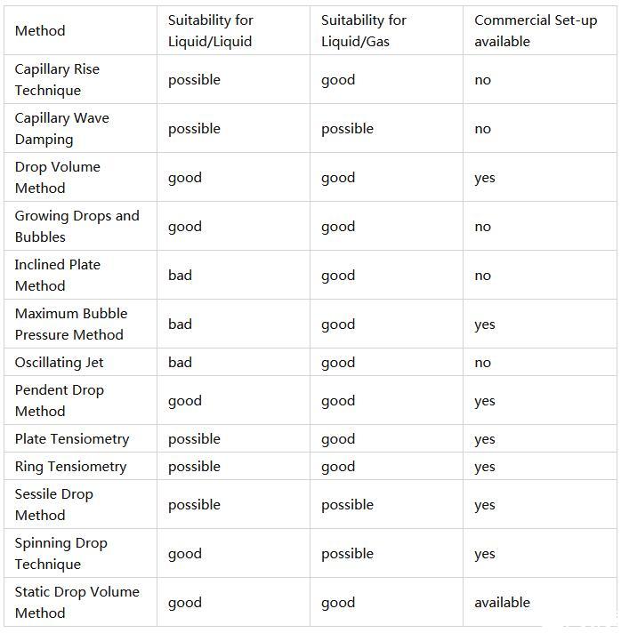 為了克服這個問題,Joos提出了一個理論,將動態(tài)方法的數(shù)據(jù)減少到所謂的界面有效壽命,相當于靜態(tài)界面達到吸附狀態(tài)所需的時間。這樣就可以直接比較所有實驗技術(shù)的測量結(jié)果。每種方法都有優(yōu)點和缺點。