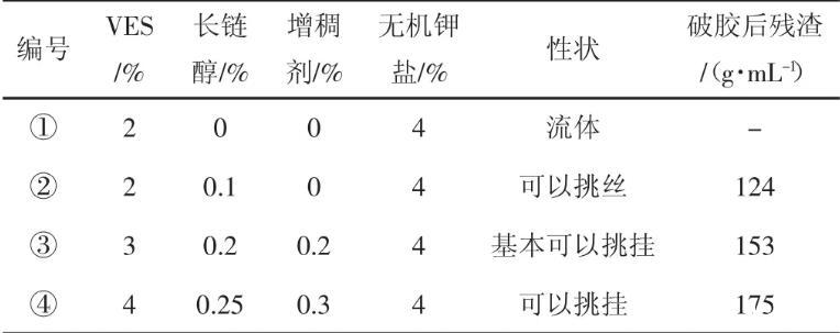 (1)甜菜堿型陽離子清潔壓裂液最優配比為4%VES+0.25%長鏈醇+0.3%增稠劑+4%無機鉀鹽。