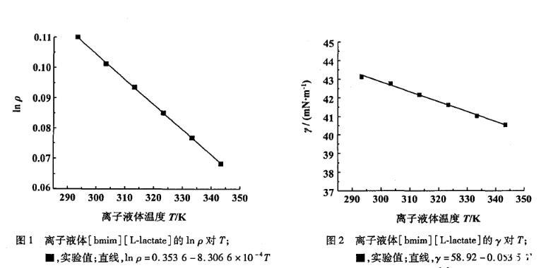 在293.15~343.15 K溫度范圍內實驗測得的離子液體[bmim][L-lactate]的表面張力值隨溫度的升高而減小(圖2),并且得到表面張力的經驗方程: