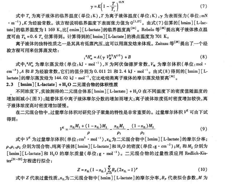 表1二元混合物[bmim][L-lactate]+H2O的V E的擬合參數BP和均方偏差(σ)
