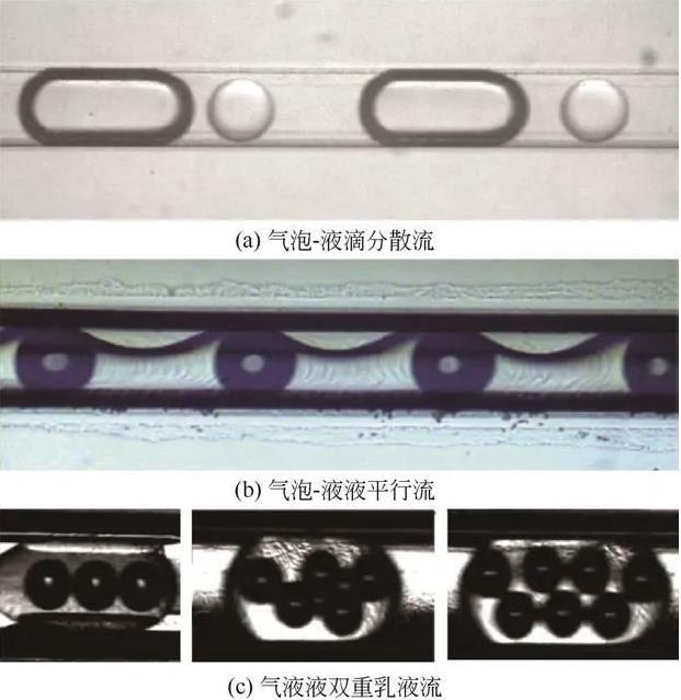 上述不同類型的微通道中所形成的流型也是學(xué)者們重點(diǎn)關(guān)注的內(nèi)容。在材料制備領(lǐng)域,流型是決定合成材料結(jié)構(gòu)的關(guān)鍵因素且直接影響著材料的相關(guān)性能;在過程強(qiáng)化領(lǐng)域,不同流型的強(qiáng)化效果差別較大,選擇并調(diào)控合適的流型是重中之重;在三相反應(yīng)中,流型可決定反應(yīng)的轉(zhuǎn)化率和選擇性,是需要優(yōu)化的重要參數(shù)之一。相比于兩相體系,三相體系由于流體間更為復(fù)雜的相互作用及更高的自由度而呈現(xiàn)出了更多的流動形態(tài)(圖3)。如Su等在十字形微通道中成功調(diào)控出液滴氣泡間隔排列的氣液液三相流。Xu等基于同軸環(huán)管微設(shè)備實(shí)現(xiàn)了氣液液雙乳液的可控制備,并揭示了流量和界面張力等因素對雙乳液結(jié)構(gòu)的影響。Wang等在雙T形通道內(nèi)通過調(diào)節(jié)操作條件可控制備了“水包油包氣”和“含有氣泡的液液平行流”兩種結(jié)構(gòu)。Rajesh等通過觀察液滴氣泡的形狀及位置關(guān)系定義了“氣柱-液柱”“彈狀-液滴”“液柱-雙氣彈”等流型。除了實(shí)驗(yàn)手段Rajesh等借助VOF數(shù)值模擬方式從機(jī)理上揭示了氣液液三相流的流動規(guī)律,歸納了不同Ca和We范圍內(nèi)的流型特征和規(guī)律。此外,Yang等通過傳質(zhì)引發(fā)相分離的方法成功調(diào)控出氣液液雙乳液,該方法能實(shí)現(xiàn)更大范圍內(nèi)氣泡直徑尺寸和液膜厚度的調(diào)節(jié)。