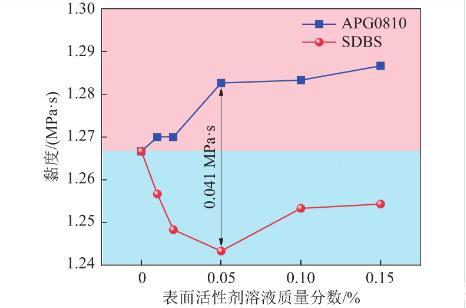 在質(zhì)量分數(shù)為0.05%時兩種表面活性劑溶液黏度相差0.041 MPa·s,達到最大值,這是由于在該質(zhì)量分數(shù)下SDBS溶液未形成膠束,且離子之間斥力最大,而APG0810溶液開始形成膠束,溶液內(nèi)分子間碰撞概率變大。