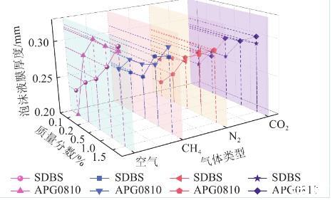 對比相同質(zhì)量分數(shù)下不同氣體注入時表面活性劑泡沫液膜厚度進行分析。注入空氣情況下,溶液質(zhì)量分數(shù)0.15%時,APG0810溶液在泡沫液膜最大,約為0.315 mm,注入甲烷泡沫液膜厚度比空氣低0.006 mm,SDBS溶液泡沫液膜厚度為0.297 mm,注入甲烷泡沫液膜厚度比空氣低0.004 mm,這是由于甲烷氣體密度低于空氣,擴散速率比空氣快。APG0810和SDBS溶液在二氧化碳注入時比空氣分別低0.002 mm和0.004 mm。這是由于二氧化碳氣體為酸性氣體,離子型表面活性劑溶液在酸性環(huán)境不易形成泡沫液膜結(jié)構(gòu),非離子表面活性劑溶液則不易受酸堿度干擾。