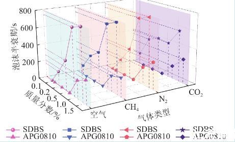 空氣、甲烷及氮氣的穩(wěn)泡性規(guī)律大致相同,注入空氣情況下,SDBS溶液質(zhì)量分數(shù)為0.15%時泡沫半衰期約為786.5 s,二氧化碳注入液體的穩(wěn)泡性明顯下降,質(zhì)量分數(shù)為0.15%時為584 s,比空氣低202.5 s。推測這是由于二氧化碳為酸性氣體,表面活性溶液在酸性環(huán)境下泡沫穩(wěn)定性不足,泡沫液膜強度不易控制酸性氣體造成的。而APG0810表面活性劑溶液泡沫半衰期在四種氣體注入情況下差異不明顯,是由于APG0810為非離子表面活性劑,在溶液中不是以離子狀態(tài)存在,由此可以推出它的穩(wěn)定性高,不易受強電解質(zhì)影響,也不易受酸、堿影響。