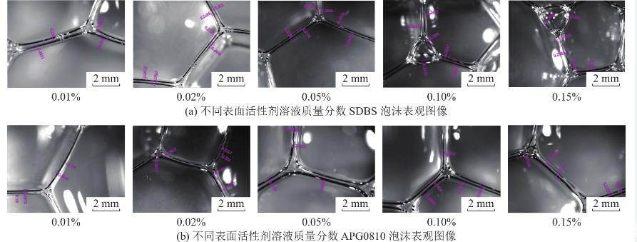 根據(jù)以上試驗結(jié)果可以獲得,溶液表面張力越小,則溶液發(fā)泡性能越好,溶液表面張力與發(fā)泡特性有較明顯相關(guān)性,而溶液黏度與泡沫性質(zhì)相關(guān)性不顯著。APG0810溶液黏度隨質(zhì)量分數(shù)增加而增加,發(fā)泡性及泡沫穩(wěn)定性也逐漸增加,而SDBS溶液黏度先隨著溶液質(zhì)量分數(shù)增加而降低,濃度較大時有上升趨勢,溶液發(fā)泡性及泡沫穩(wěn)定性呈現(xiàn)逐漸增加趨勢,且發(fā)泡性與泡沫穩(wěn)定性均優(yōu)于APG0810溶液。