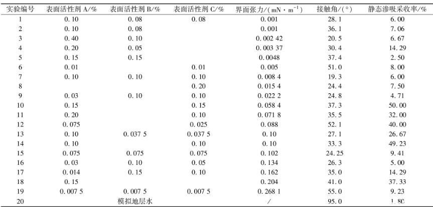 根據國內外學者的研究,滲吸液對滲吸的影響主要是改變油水界面張力、潤濕性、乳化性和pH值。乳化性主要是通過乳化分散,從而增強油滴在巖心孔道內的流動能力;pH值則主要是影響滲吸液的乳化能力。本次實驗采取靜態滲吸的方式,乳化性的作用相對較小,故滲吸液配制指標為界面張力與潤濕性。