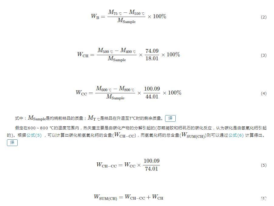 假定在600~800℃的溫度范圍內(nèi),熱失重主要是由碳化產(chǎn)物的分解引起的(忽略凝膠和鈣礬石的碳化反應(yīng),認(rèn)為碳化是由氫氧化鈣引起的)。根據(jù)公式(5),可以計(jì)算出碳化前氫氧化鈣的含量,而氫氧化鈣的總含量則可以通過(guò)公式(6)計(jì)算得出。