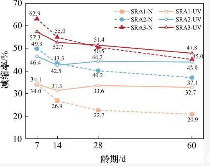為了進一步分析SRA試驗組在2種環境下干縮變形隨摻量變化的規律,計算了SRA試驗組相對于基準組的干縮降低率,即減縮率。計算結果如圖5所示:在試驗齡期內,摻加SRA的水泥石在強紫外線輻射環境下的減縮率維持在相對穩定的水平;14 d齡期后,相同摻量的SRA試驗組在強紫外線輻射環境下的減縮率逐漸接近并最終超過其在標準干燥環境下的減縮率。然而,隨著減縮劑摻量的增加,強紫外線輻射環境下減縮率的提升幅度受到限制。具體而言,SRA摻量為3%時,減縮效果的提升幅度非常微弱。這也導致了在強紫外線輻射下,SRA試驗組的干縮變形增長幅度隨著摻量變化呈現出不同的規律。