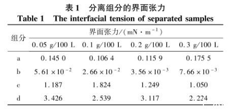 由表1可知,組分b質(zhì)量濃度達到0.2 g/100 L時,即可使該油/水體系的界面張力降至超低(低于10-3mN/m),而其他組分即使在較高質(zhì)量濃度的情況下,依然不能使其油/水體系的界面張力達到超低,其中組分d在降低該體系界面張力方面的能力最差。說明石油磺酸鹽活性組分的組成差異是影響系列石油磺酸鹽具有不同界面活性的主要因素。