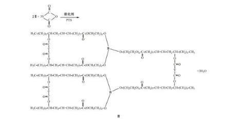 待反應(yīng)液冷卻至50℃,向反應(yīng)液中加入0.12 mol蓖麻油酸與催化劑對(duì)甲基苯磺酸(PTS的質(zhì)量為蓖麻油、聚乙二酸與硼酸總質(zhì)量的1%),升溫至140℃,在負(fù)壓下進(jìn)行反應(yīng),至體系酸值不變,酯化過(guò)程如下所示: