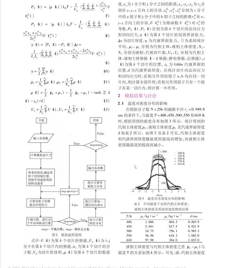 式中:U(k)為第k個切片的勢能,Uij(k)為i、j分子在第k個切片內的勢能,nk為第k個切片的分子數,Vs1為切片的體積,ρ(k)為第k個切片的數密度,rij為i分子和j分子之間的距離,xij、yij、zij為rij分別在x、y、z方向上的分量,、、分別為i分子中的a原子和j分子中的b原子之間的距離在x、y、z方向上的分量,U()為勢函數U()對的導數,PN(k)、PT(k)分別為第k個切片的法向應力和切向應力,γ(k)為第k個切片的局部界面張力,Δz為切片厚度,γ為汽液界面張力,〈〉為系統統計平均,ρV、ρL分別為汽相主體、液相主體密度,NL、NV分別為液相、汽相切片數,UV、UL分別為汽相主體、液相主體勢能(L-J勢能、靜電勢能、總勢能),z(k)為第k個切片的位置,z0為Gibbs汽液界面的位置,d為汽液界面厚度。在統計切片內法向應力和切向應力時,若相互作用的原子a,b均在同一切片內,則計算全部作用;若相互作用原子只有一個原子在某一切片內,則計算一半作用。