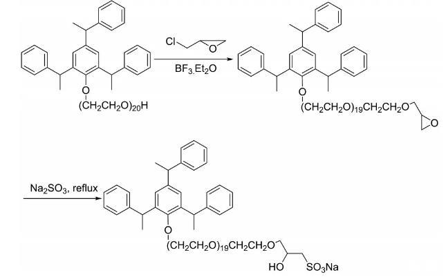 采用“一鍋煮”法制備表面活性劑,合成路線如圖1所示。將一個帶有機械攪拌器,回流冷凝管和恒壓滴液漏斗的500 mL三頸瓶置于80℃的恒溫水浴中,先后加入92 g的三苯乙烯苯酚聚氧乙烯醚-25和75 mL的正庚烷,向攪拌后形成的溶液中加入2 mL的三氟化硼乙醚催化劑,用恒壓滴液漏斗滴加過量的環氧氯丙烷溶液,滴加完后升溫至90℃反應3 h;然后滴加20%NaOH水溶液,維持反應體系的pH值在7.5~9,TLC監測反應進程到原料點消失后結束反應。向產物中加入二甲亞砜,溶解后過濾除去反應中生成的鹽;用正庚烷萃取、水洗后旋轉蒸發除去溶劑;將粗產物溶解于乙醇中,向其中滴加100 mL的25%的亞硫酸鈉溶液,分批加入6 mol/L的鹽酸溶液維持反應體系的pH值在7~9,在80℃的恒溫水浴中繼續反應過夜,將反應物用熱的異丙醇萃取后過濾除去無機鹽,將濾液旋轉蒸發除去溶劑得到黃色產物三苯乙烯基聚氧乙烯醚羥丙基磺酸鈉,即為表面活性劑TPHS。