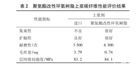 采用聚氨酯改性環氧樹脂上漿劑制備的碳纖維性能見表2。