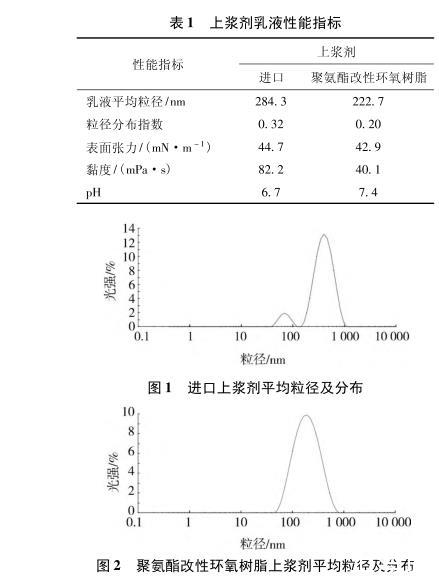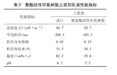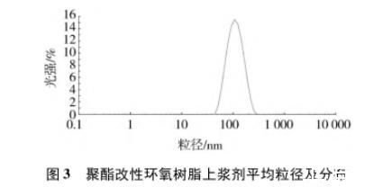 制備的聚酯改性環氧樹脂上漿劑乳液性能見表3,粒徑及分布測試結果見圖3。