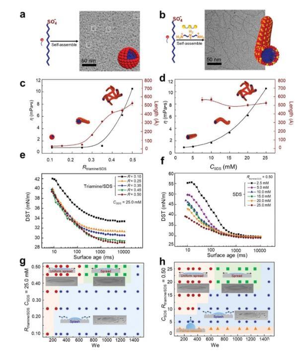 圖2.撞擊結果的物理化學性質和相圖。a,b)SDS和三胺/SDS聚集狀態的示意圖和低溫透射電鏡圖像。a)單獨的SDS形成小的球形膠束,用虛線矩形突出顯示。b)加入三胺后,三胺/SDS形成長而密集的纏結線性膠束。c,d)在不同摩爾比R和摩爾濃度CSDS下三胺/SDS的粘度和聚集長度。在臨界摩爾比或摩爾濃度之后,膠束伸長并纏結成網絡結構,導致粘度急劇增加。e,f)不同R和CSDS下三胺/SDS的動態表面張力(DST)曲線。隨著R和CSDS的增加,初始和平衡表面張力均顯著降低。g,h)不同We數下三胺/SDS液滴撞擊超疏水表面的動態行為相圖。在高We下,含有三胺/SDS添加劑的液滴只有在特定的摩爾比(0.45–0.50)和特定的摩爾濃度(>20.0×10?3 m)下才能完全沉積在超疏水表面上。
