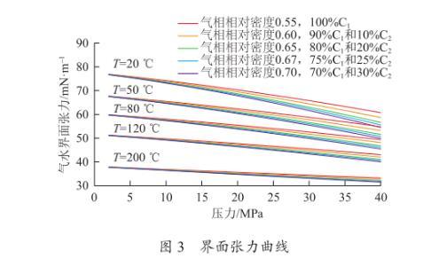 如圖3所示為利用新模型繪制的不同溫度和壓力下的界面張力曲線。從圖中可知,壓力越大,溫度越高,氣水界面張力越小;氣體相對密度越大,氣水界面張力越小。當壓力和溫度分別為0~40 MPa和20~200℃時,界面張力范圍為30~75 mN/m,不能看成常數。