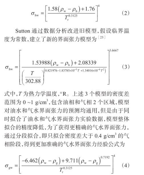 式中,T為熱力學溫度,°R。上述3個模型的密度差范圍為0~1 g/cm3,包含油相和氣相2個區域,模型對油水和氣水界面張力的預測均通用,但是由于同時擬合了油水和氣水界面張力實驗數據,模型整體擬合的精度降低,為了獲得更精確的氣水界面張力,通過分段擬合,即只擬合密度差大于0.4 g/cm3的氣相階段,得到更加準確的氣水界面張力經驗公式為