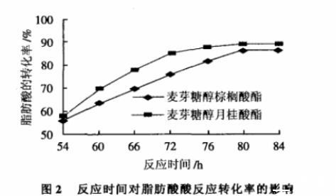 綜合上述實驗結(jié)果,以脂肪酶Novozym 435為催化劑,用量為0.24g/mmol脂肪酸,脂肪酸用量為1mmol,麥芽糖醇用量為2.0mmol,溶劑用量為10mL,在60℃條件下反應(yīng)80h,棕櫚酸和月桂酸的轉(zhuǎn)化率分別達91%和95%。該結(jié)果是本實驗條件范圍內(nèi)的最好結(jié)果。