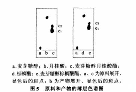 圖5為展開劑展開后的薄層色譜圖。麥芽糖醇月桂酸酯的質(zhì)譜鑒定:麥芽糖醇(單)月桂酸酯和麥芽糖醇雙月桂酸酯的相對分子質(zhì)量分別為526.3和708.3,質(zhì)譜圖中出現(xiàn)549.4峰和731.3峰分別為[M單酯+Na]和[M雙酯+Na]的質(zhì)譜信號,說明薄層色譜圖5中的c1和c2分別為麥芽糖醇單月桂酸酯和麥芽糖醇雙月桂酸酯。
