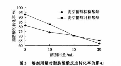 在麥芽糖醇用量為1.0mmol、脂肪酸用量0.5mmol、脂肪酶Novozym 435用量為0.15g,60℃反應(yīng)72h的條件下,考察改變?nèi)軇┍昧繉Ψ磻?yīng)的影響,結(jié)果如圖3所示。