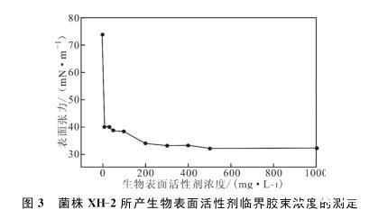 菌株XH-2所產生物表面活性劑具有溫度、pH值和鹽度穩定性,其臨界膠束濃度為200 mg·L-1,明顯低于常用的化學表面活性劑,具有良好的工業應用價值。