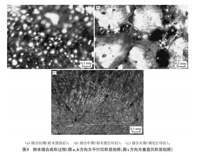圖5粉末熔合成形過(guò)程(圖a、b方向?yàn)槠叫谐练e層拍照;圖c方向?yàn)榇怪背练e層拍照)