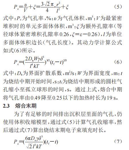 為了有足夠的時(shí)間排出沉積層里面的氣孔,仍使用體積收縮模型,通過(guò)式(5)計(jì)算氣孔收縮率,然后通過(guò)式(7)算出燒結(jié)末期電子束填充時(shí)長(zhǎng)。