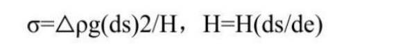 在(25±0.1)℃下使用光學(xué)測(cè)量?jī)x,使用注射器注射液體呈現(xiàn)出最大直徑de的液滴時(shí),通過L-Y方程計(jì)算液體的表面張力σ的大小。對(duì)于每個(gè)溶液的表面張力值計(jì)算四次測(cè)量的平均值,以減小實(shí)驗(yàn)誤差,表面張力(mN/m)的計(jì)算如下面所示: