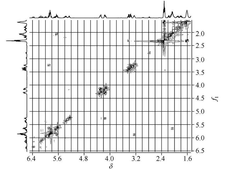 桐油及桐油酸酐的1H NMR見圖2,從圖中可以看出,隨著加成反應(yīng)的進(jìn)行,桐油中的烯鍵上的氫信號(hào)(8~13),TM2烯鍵上的氫信號(hào)(11~17)及TM3烯鍵上的氫信號(hào)(11~13)明顯減弱,峰型也發(fā)生很大變化。依據(jù)圖2(b)中的各峰積分面積比例確定桐油與兩個(gè)馬來酸酐反應(yīng)形成TM2,進(jìn)一步與馬來酸酐反應(yīng),共軛三烯的氫信號(hào)[圖2(b)中14~17]完全消失。由于桐油結(jié)構(gòu)較復(fù)雜,1H NMR歸屬較困難,TM 2經(jīng)1H-1H COSY譜(圖3)分析,從圖3中可以看出,信號(hào)3和6相關(guān),為甘油酯緊連的兩個(gè)亞甲基氫;6′和8相關(guān),為新生成的六元環(huán)相鄰的兩個(gè)氫;5和5′分別與12和12′相關(guān),7和13、13′相關(guān),9和10相關(guān),11和14相關(guān),14和17相關(guān),12、17與15、16相關(guān)。結(jié)合圖2(b)、圖2(c)中信號(hào)7、8、9的積分比例分別為1∶2∶2及3∶6∶4,及TM2的1H-1H COSY譜分析,TM2及TM3結(jié)構(gòu)各質(zhì)子信號(hào)歸屬如圖2所示。