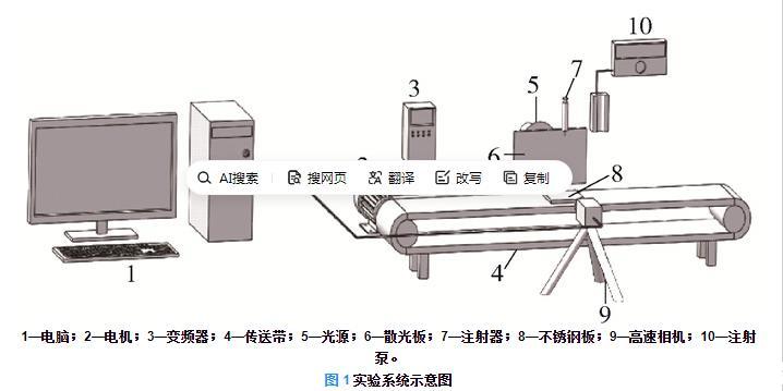 1—電腦;2—電機;3—變頻器;4—傳送帶;5—光源;6—散光板;7—注射器;8—不銹鋼板;9—高速相機;10—注射泵。