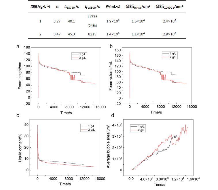 泡沫發泡性和穩定性是表征泡沫性能的重要參數。我們配制了不同質量分數的C72-MPB水溶液,對其泡沫性能進行測試。