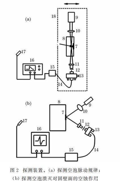 圖2探測(cè)裝置。(a)探測(cè)空泡脈動(dòng)規(guī)律;(b)探測(cè)空泡潰滅對(duì)固壁面的空蝕作用